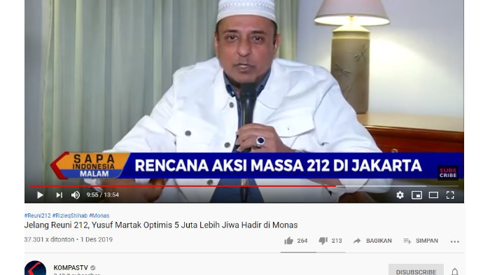 Sekretaris Jenderal (Sekjen) Partai Nasional Indonesia (PNI) Marhaenisme, Ibnu Prakoso tidak mendukung adanya reuni gerakan 212. (Channel Youtube Kompas TV)