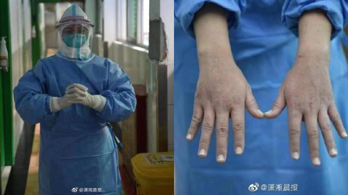 Pada foto yang diunggah oleh akun @PDChina nampak tangan suster Hu Pei dipenuhi luka dan lecet sehingga berwarna merah-merah.