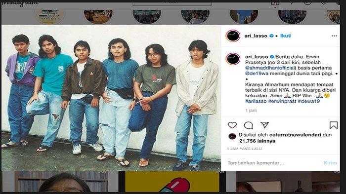 "Berita duka. Erwin Prasetya, basis pertama @de19wa meninggal dunia tadi pagi. Kiranya Almarhum mendapat tempat terbaik di sisiNya. Dan keluarga diberi kekuatan. Amin RIP Win..," tulis Ari Lasso, seperti dikutip Kompas.com, Sabtu (2/5/2020).