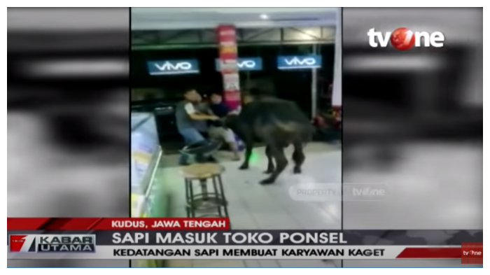 TRIBUNWOW.COM - Gerai ponsel di Kudus, tepatnya di Desa Jepang, Kecamatan Mejobo dikejutkan dengan kedatangan seekor sapi.