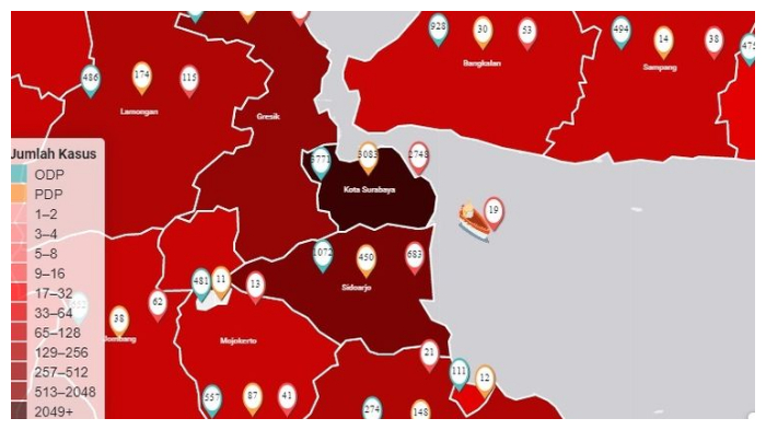 Beberapa daerah lainnya di Jawa Timur pun berwarna merah pekat, seperti Sidoarjo dengan 683 kasus dan Gresik 183 kasus.