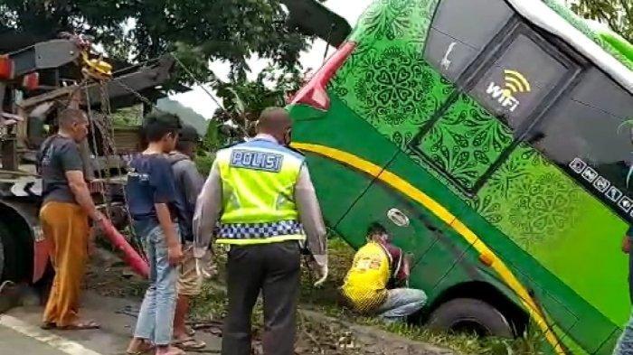 "Kendalanya adalah medan yang curam di lokasi bus nyungseb, sehingga saat bus ditarik ada bagian kolong bus yang nyangkut ke tanah," kata Kanitlantas Polsek Kadupaten, Iptu Edi, Rabu (16/12).