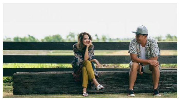 keduanya tampak mengenakan setelan senada, yakni putih dan berada di antara dua pohon kelapa yang menjulang.