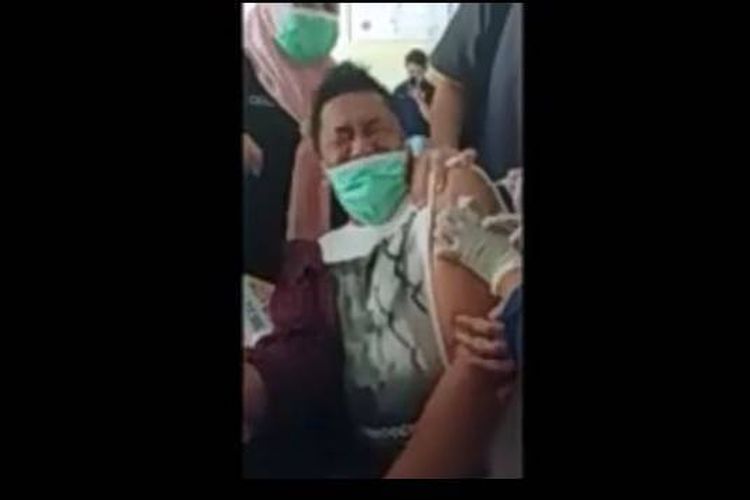 TRIBUNWOW.COM - Kepala Puskemas Bone, Kabupaten Bone Bolango, Gorontalo, Awaludin Rahim, terpaksa harus dipegangi sejumlah petugas medis saat hendak divaksin Covid-19.