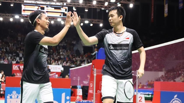 Pasangan duet Mohammad Ahsan ini sempat memenangkan pertandingan babak pertama melawan pasangan asal Inggris, Ben Lane/Sean Vendy.