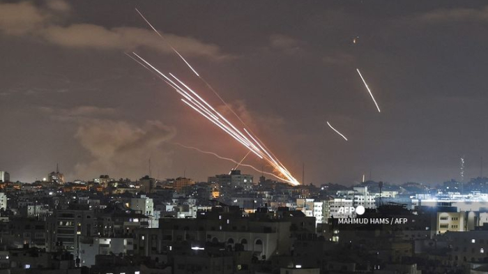 Pemandangan ketika roket diluncurkan ke arah Israel dari Gaza City, yang dikontrol faksi Hamas, pada 12 Mei 2021, di tengah intensnya pertikaian dua kubu selama tujuh tahun terakhir.