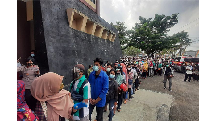 Warga tampak berkerumun di luar gedung dan tidak menerapkan protokol kesehatan.