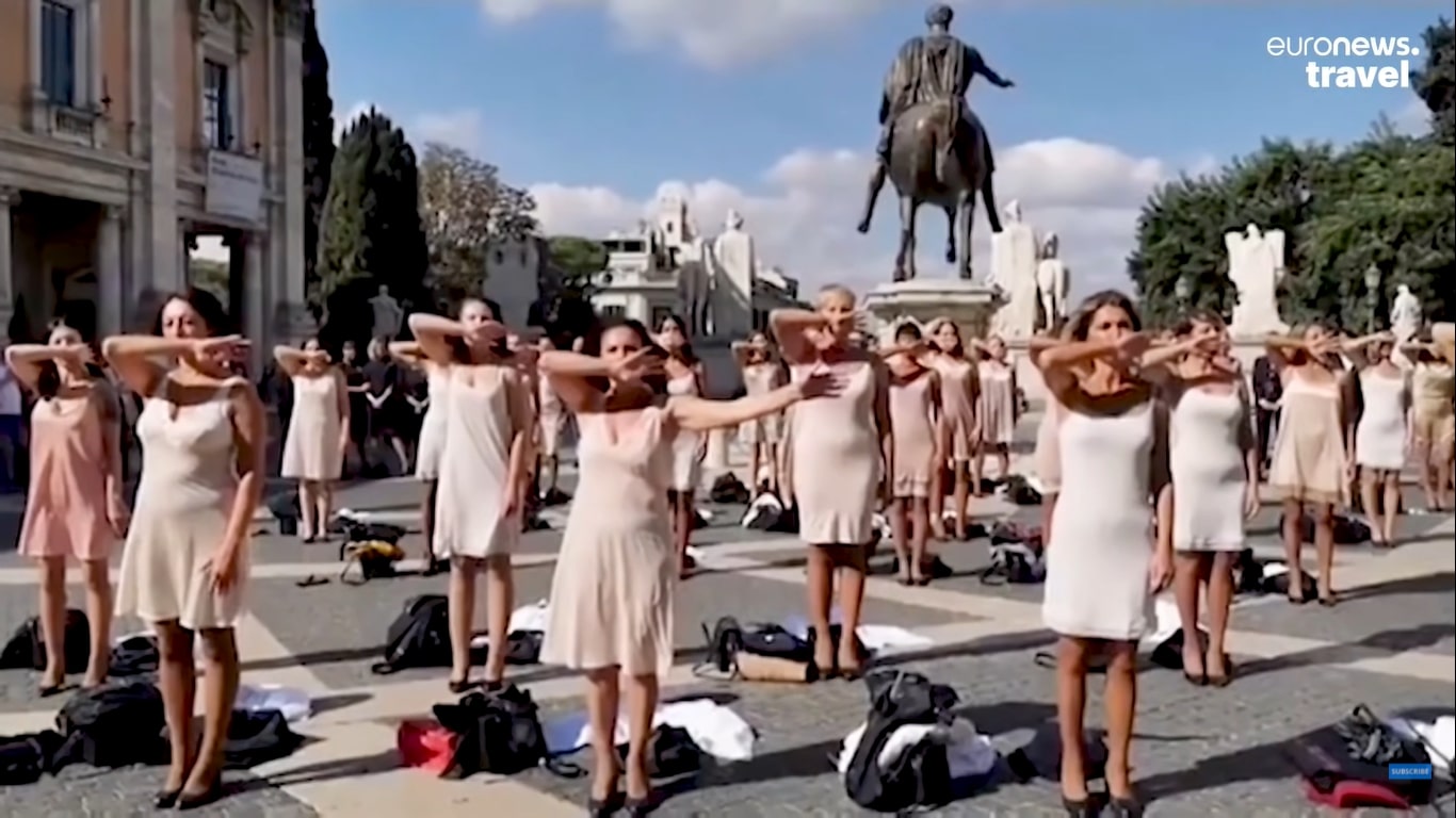 Dalam aksinya, 50 mantan pramugari berdiri berbaris di alun-alun di atas Capitoline Hill Rome.