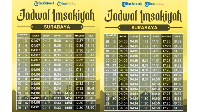 Simak berikut inni jadwal imsakiyah dan buka puasa untuk wilayah Surabaya, Jawa Timur, Ramadhan 1443 H/2022.