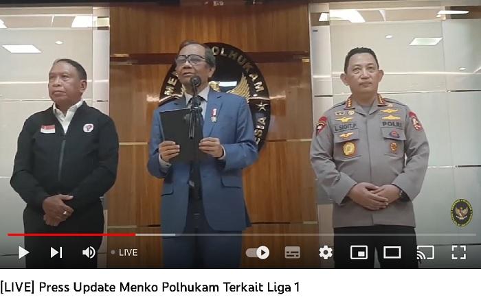 "Mewakili pemerintah bersama pak Menpora (Zainudin Amali), pak Kapolri (Listyo Sigit Prabowo) untuk menyampaikan kebijakan pemerintah tentang kegiatan sepak bola sesudah peristiwa Kanjuruhan," ucap Mahfud MD didampingi Menteri Pemuda dan Olahraga (Menpora) Zainudin Amali dan Kapolri Jenderal Listyo Sigit Prabowo.