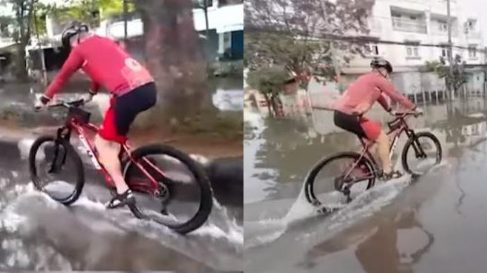 Gubernur Jawa Tengah Ganjar Pranowo menerabas banjir dengan mengayuh sepeda saat melakukan peninjauan.