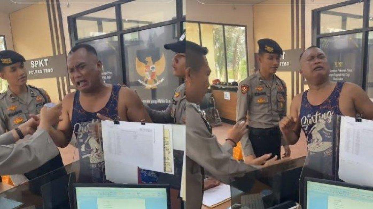 Dalam rekaman yang beredar, mulanya terlihat seorang pria dicoba ditenangkan petugas saat berada di kantor polisi bagian Sentra Pelayanan Kepolisian Terpadu (SPKT).