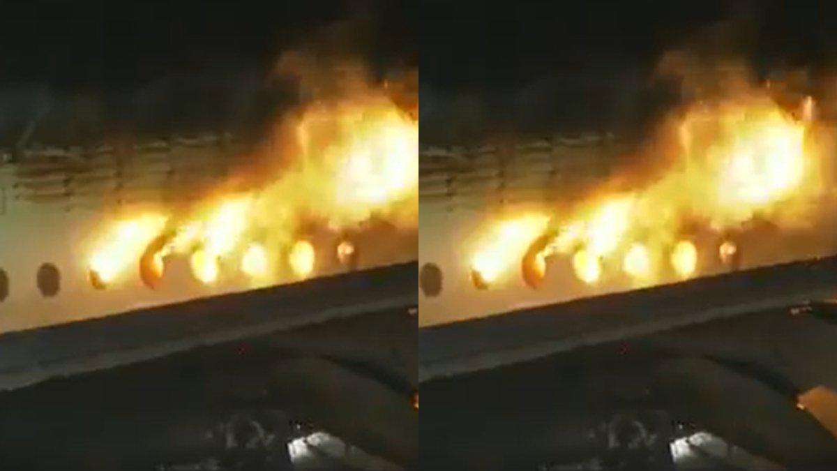 Dalam rekaman video yang dibagikan oleh lembaga penyiaran publik Jepang NHK menunjukkan api keluar dari jendela pesawat.