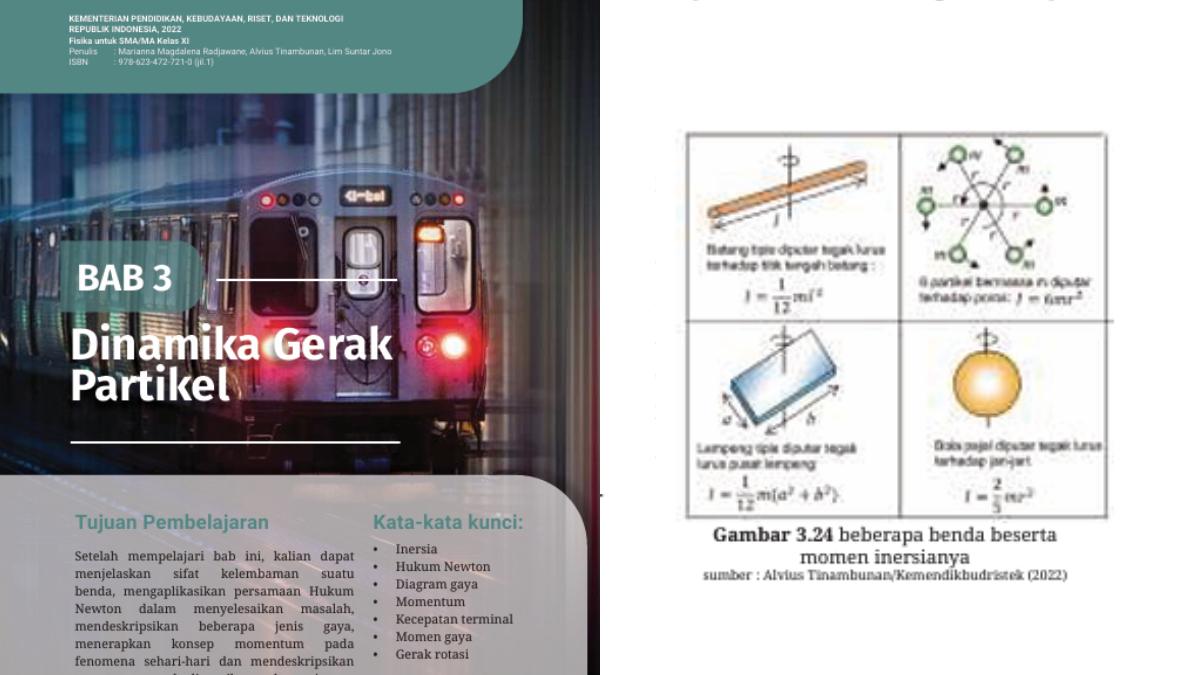 Kolase foto halaman sampul Bab 3 Fisika kelas 11 SMA kurikulum merdeka bertajuk Dinamika Gerak Partikel (kiri) dan tangkapan layar Gambar 3.24 beberapa benda beserta momen inersianya (kanan). Terkini, inilah kunci jawaban Fisika kelas 11 SMA soal asesmen Bab 3 halaman 87-88 tentang dinamika gerak partikel.