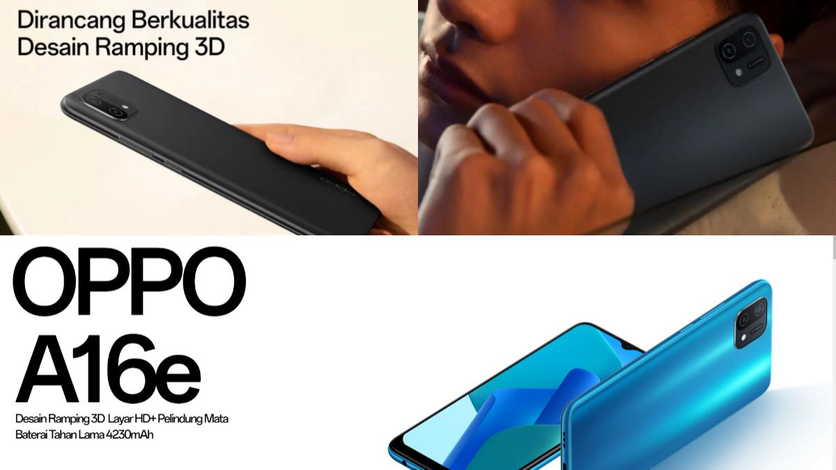 oPPO A16e yang memiliki desain ramping 3 dimensi, serta layar besar hingga terdapat proteksi mata.