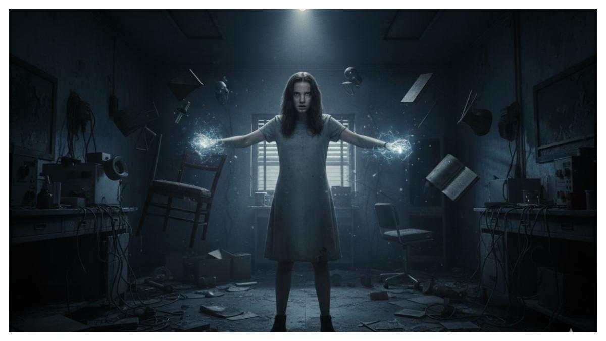 Aku mengenakan pakaian sederhana atau gaun yang sedikit robek, dengan efek telekinesis yang samar-samar terlihat di sekitar tangan atau benda-benda di sekitarku yang melayang.