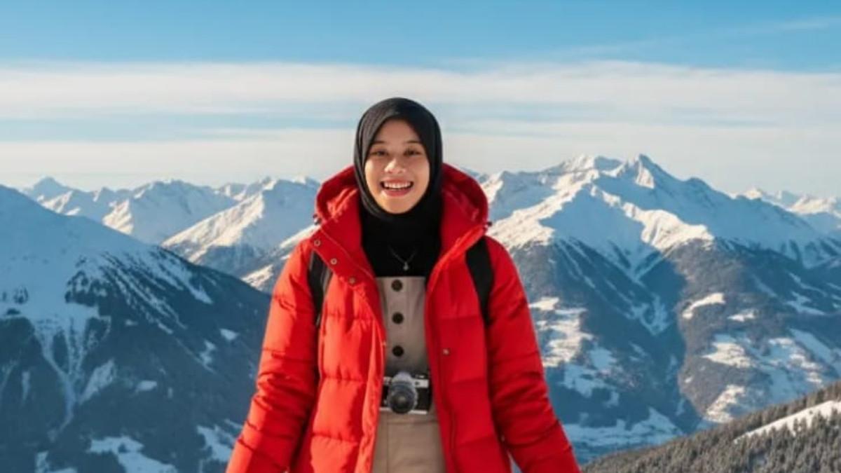 “Edit foto agar tampak sedang berada di pegunungan Alpen Swiss, latar belakang salju dan langit biru, ekspresi bahagia, mengenakan jaket tebal musim dingin.”