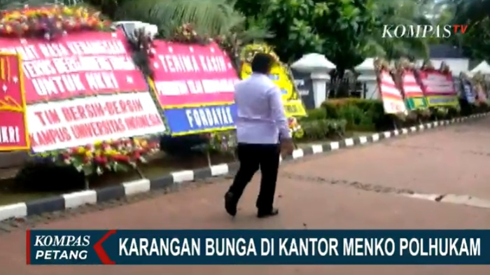 Kantor Kementerian Koordinator Politik Hukum dan Keamanan dibanjiri karangan bunga.