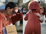 Menyusuri jalanan kota Hefei, Cina, pria ini menjajakan pelukannya kepada para pengguna jalan dan pengunjung taman.
