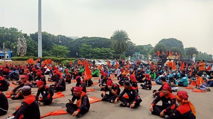 Partai Buruh kembali melakukan unjuk rasa di kawasan Patung Kuda, Monas, Jakarta Pusat, untuk menyampaikan sejumlah tuntutan, Rabu (26/7/2023).