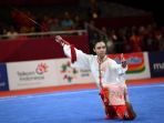 Atlet wushu putri, Lindswell Kwok, mempersembahkan medali emas kedua bagi kontingen Indonesia pada Asian Games 2018.